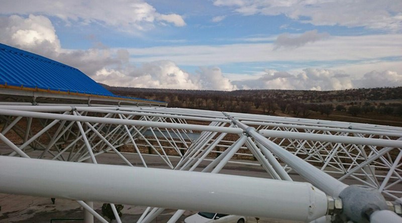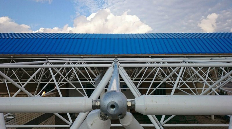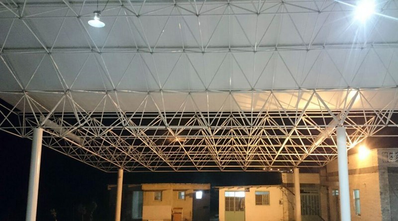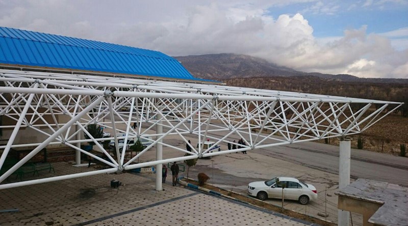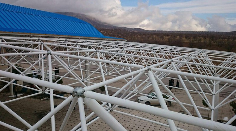 به منظور پوشش غسال خانه بهشت رضای شهر ایلام از یک شبکه دولایه فضاکار با نقش دوراهه روی دوراهه با اتصالات گوی سان استفاده شده است. این سازه در ارتفاع 6 متری نصب و اجرا گردیده است.