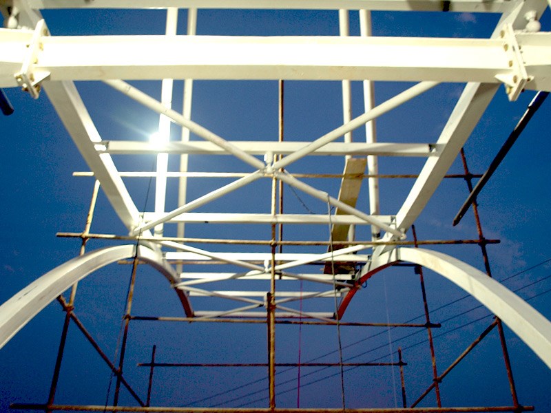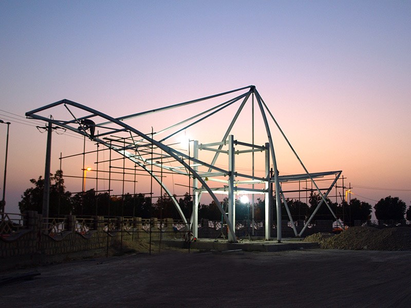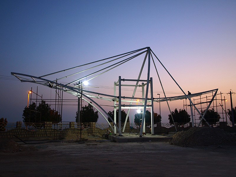 سیستم سازهای این سردر ترکیبی از المانهای پیچی و جوشی میباشد که استفاده از خمکاری در پروفیلهای لوله و قوطی نرمی و لطافت بیشتری به فرم معماری سازه داده و طرح اجرا شده را با اتود اولیه معماری نزدیکتر نموده است. اتصالات این سازه، چه اتصال راس و چه اتصالات المانهای عرشه همگی برای این موضوع خاص ابداع و طراحیشدهاند.