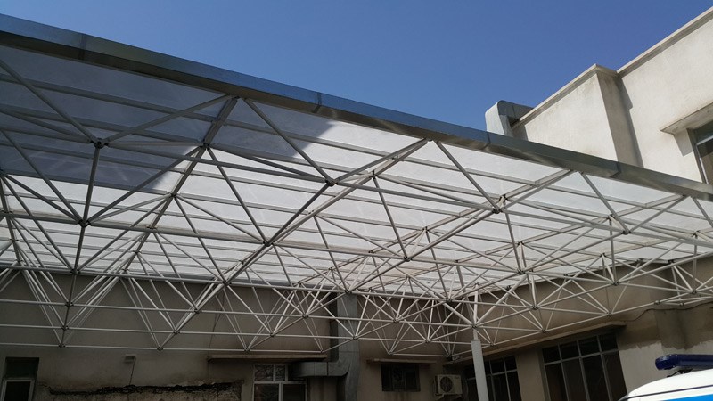 سقف سازه فضاکار بیمارستان بوعلی در ورودی ساختمان ICU و CCU بیمارستان بوعلی جهت تفکیک فضای خارجی و داخلی احداث شده است.