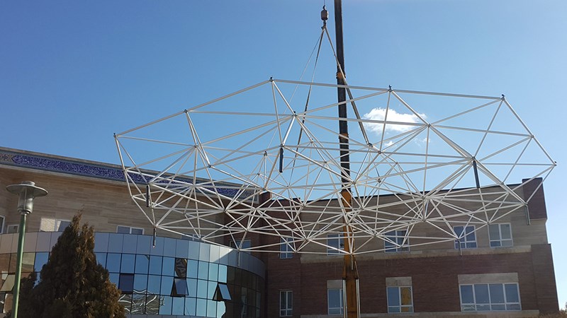 این پروژه در دانشگاه قم اجرا شده است و شامل سه سازه فضایی مربوط به نورگیر های دانشگاه می باشد. دو عدد از این سازه های فضاکار با پلان مربع بوده به طوری که لایه پایین مسطح و لایه بالا به صورت دو شیب می باشد و سازه فضاکار سوم در پلان و لایه بالا با طرح 8 وجهی منظم و در لایه پایین مسطح طراحی شده است از این بابت نمایی بسیار زیبا از نمای داخلی دانشگاه ایجاد نموده است.