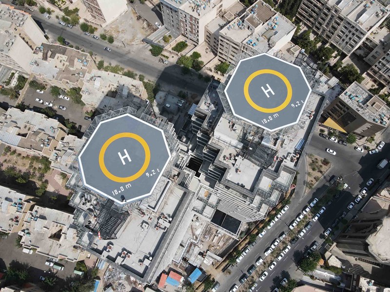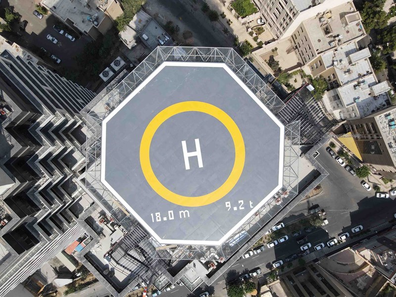 دو هلی پد اضطرار برج های دو قلو میکا با قطر 18 متر و به شکل 8 ضلعی توسط شرکت سازه های افق نور طراحی، ساخته و اجرا شده است. سازه اصلی این هلی پدها، سازه فضاکار دولایه با سیستم گوی سان بوده که بوسیله عرشه فولادی پوشانده شده است.