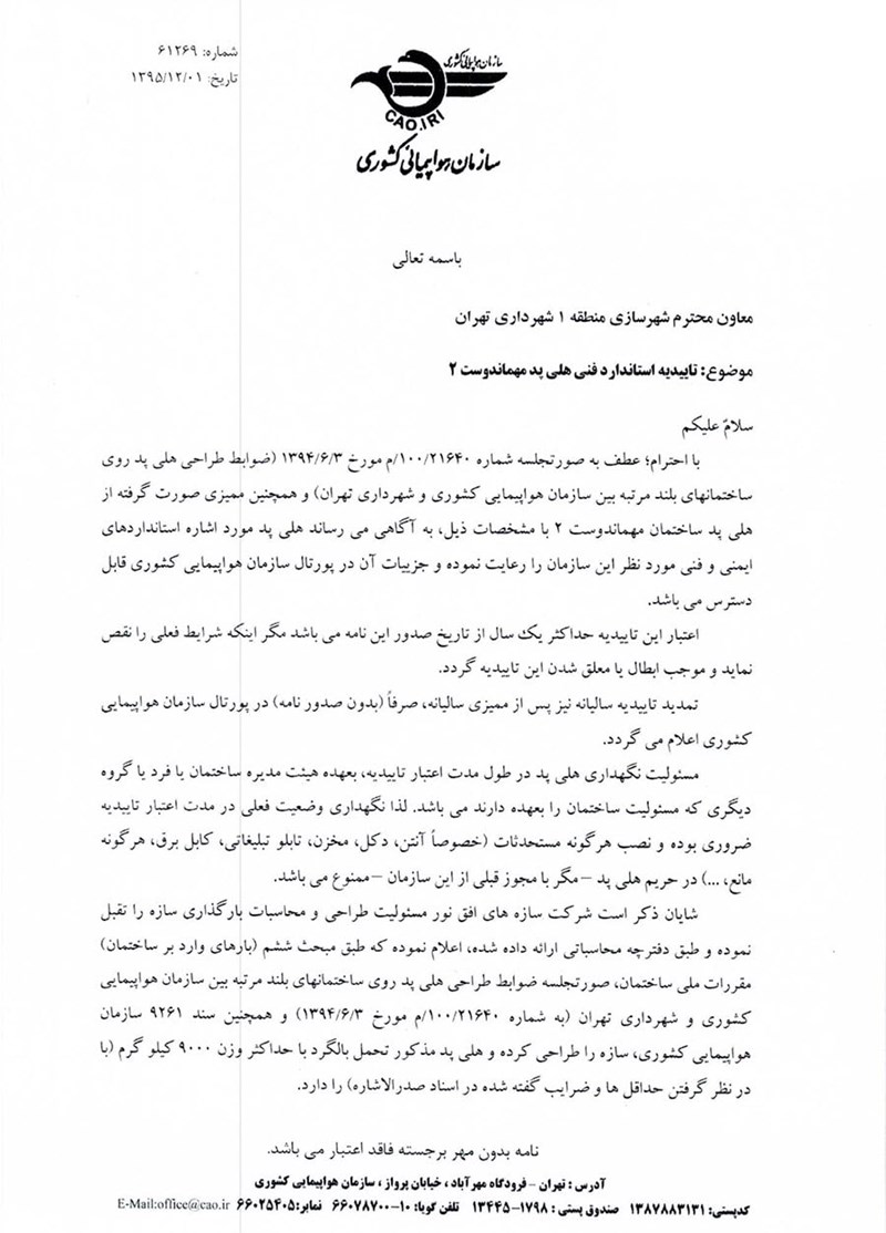 هلی پد اضطرار ساختمان مهماندوست 2 در منطقه نیاوران تهران واقع شده است. این هلی پد به قطر 18 متر و با به کارگیری سازه فضاکار گوی سان به عنوان سازه اصلی به همراه عرشه ی فولادی طراحی و اجرا گردیده است. استفاده از سازه های فضایی در هلی پدها علاوه بر زیبایی و استحکام مناسب، با سبک تر کردن وزن سازه ی هلی پد، بار مرده و بار لرزه ای کمتری را در مقایسه با سازه های بتنی و سازه های فولادی(سازه های فولادی طراحی شده با تیر ورق)به سازه اصلی ساختمان وارد می کند.