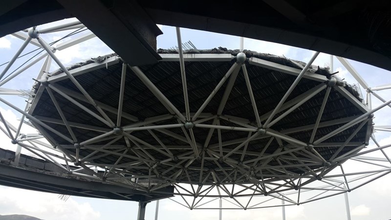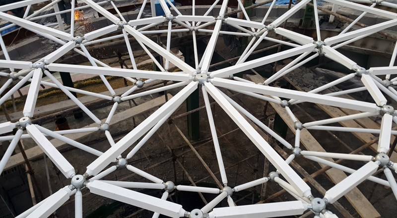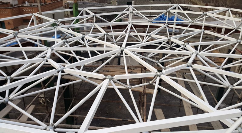 این سقف قابلیت تحمل وزن بتن سقف را داشته و ضمناً به صورت حلزونی و مارپیچ طراحی شده است تا با فرم کلی سقف ویلا مطابقت داشته باشد. همچنین شبکه بندی هم مرکز طراحی شده، باعث ایجاد نمایی زیبا از قسمت داخلی ساختمان شده است.