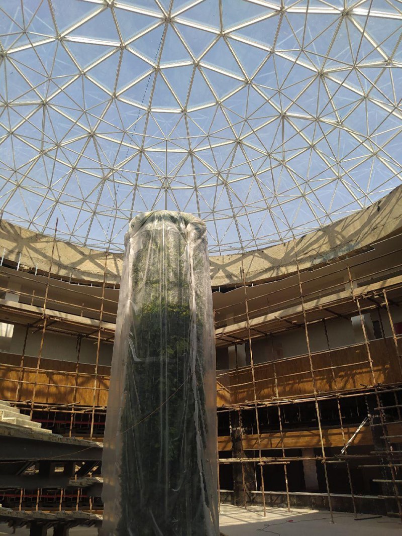 پوشش شیشه دوجداره این آسمان نمای (اسکای لایت / skylight) نیز بوسیله 3 لایه شیشه سکوریت لمینیت شده و دوجداره V-cool و با بکارگیری شیشه stop-ray titanium محصول شرکت AGC ساخت کشور بلژیک طرح و اجرا گردیده است.به منظور اتصال سازه فولادی و پوشش شیشه ای و همچنین آب بندی این آسمان نما از (پروفیل های المینیومی) لامل های مخصوص سیستم کرتین وال (Curtain wall) اسکای لایت (skylight) استفاده شده است.این آسمان نما (اسکای لایت / skylight) متناسب با وضعیت اقلیمی منطقه خوزستان و کاربری آن به گونه ای طراحی و اجرا شده است تا علاوه بر زیبابی در فرم، دما و نور مطلوبی را برای سالن عمومی این مجموعه و پرسنل مشغول در آن فراهم نماید.